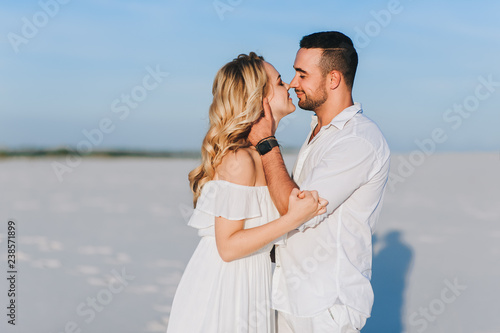 A bearded man and a blond woman hugging against the background of white sand, dune. Love story in the empty. Newlyweds in white clothes.