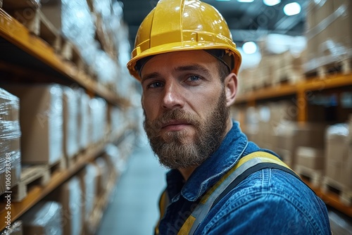 man, warehouse, bearded, hard, hat, yellow, blue, denim, jean, safety, men at work, work, job, industrial, construction, factory, serious, focused, eye, look, face, expression, aisle, shelf, pallet, box, cardboard box, storage, industry, logistic, labor, professional, employee, occupation, shopkeeper, uniform, gear, hard hat, helmet, protective, equipment