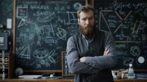 A bearded man standing confidently with crossed arms in front of a chalkboard filled with complex mathematical and scientific equations, representing knowledge and expertise.