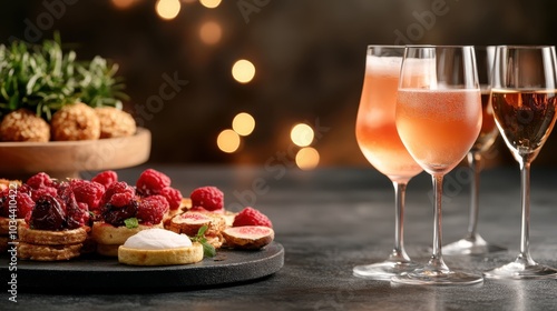 dessert, drink, sparkling, evening, pastry, table, festive, raspberry, celebration, joy, indulgence, savour, epicure, artful, posh, elegant, modern, culinary, cookery, delicious, appetiser, sweet, luxury, sophisticated, charming, social, warmth, ambience, food, stylish, presentation, contemporary, holiday, decor, decorative, party, feasting, delight, pleasure, illumination