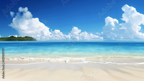 A beautiful beach with a clear blue ocean and a few small islands in the distance. The sky is mostly clear with a few clouds scattered throughout. The scene is peaceful and serene, with the calm ocean