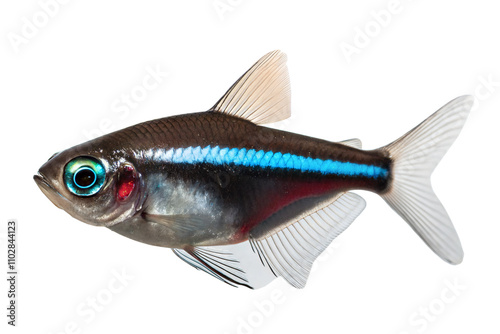 A beautiful black neon tetra fish (Paracheirodon innesi) on isolated white background.