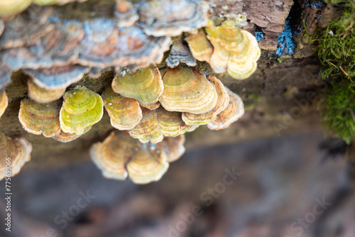 A beautiful close-up of wood decay fungi growing during early spring. A natural scenery of Northern Europe woodlands.