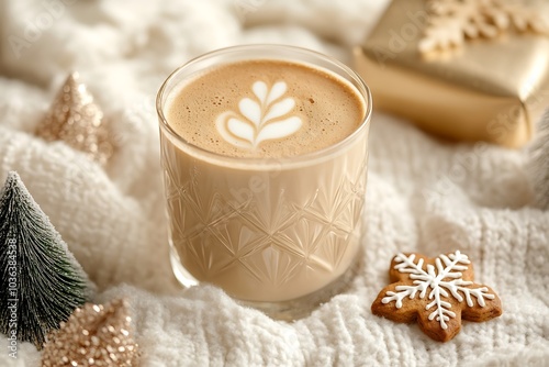 A beautiful cup of hot chocolate with gingerbread cookies on the side, with golden decorations and silver accents, in an elegant setting, with snowflakes and a white tablecloth