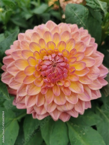 A beautiful dahlia flower with a blend of pink and yellow petals, creating a warm, vibrant gradient. Shot in a garden with green foliage.