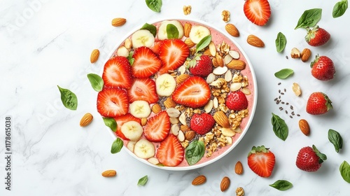 A beautiful flat lay of a strawberry smoothie bowl garnished with sliced fruits, nuts, and seeds, set against a marble background, showcasing healthy eating