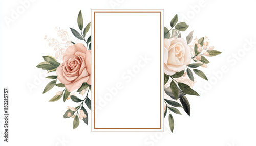 A beautiful floral frame featuring soft pink roses and greenery, perfect for invitations or greeting cards.