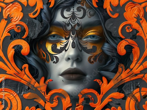 A beautiful, highly detailed portrait of a woman with dark hair and blue eyes. She is wearing a black and gold mask, and there are orange floral patterns around her.