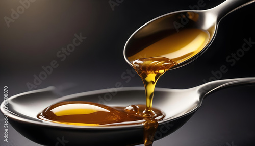 A beautiful image of honey pouring from a spoon into another spoon against a dark background.