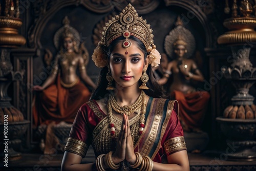 A beautiful Indian girl in a traditional Indian national costume, sari. Against the background of elephants. The portrait symbolizes the traditions, culture and beauty of the people of India.