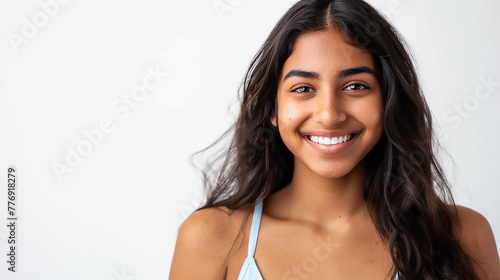 A beautiful indian young woman with long dark hair, wearing a light blue tank top and smiling to the camera isolated on a white background