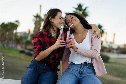 A beautiful lesbian young couple embraces. Girls drinking juice. LGBT community