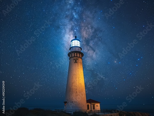 A beautiful lighthouse at night with the milky way visible in the night sky.