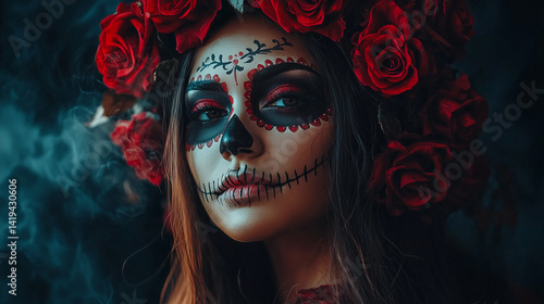 A beautiful mexican brunette with sugar skull makeup and a wreath of red roses, full-body portrait, dark background, studio photography, realistic skin texture, black. Santa Muerte style