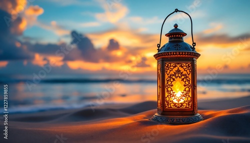 A beautiful, ornate lantern, lit from within, sits on a sandy beach at sunset