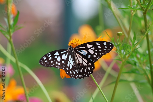 A beautiful painted lady butterfly with colorful wings rests on a vibrant flower in a summer garden