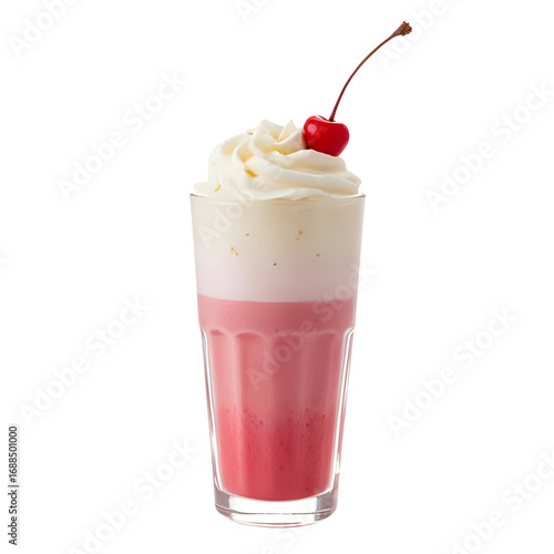 a beautiful pink milkshake with a cherry on top isolated on a transparent background