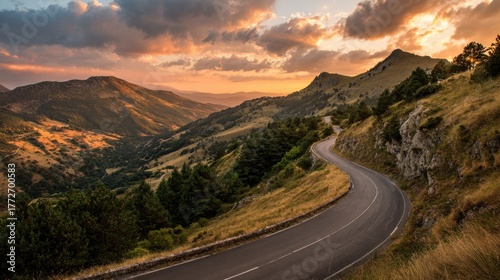 mountain, sunset, road, hill, landscape, nature, sky, cloud, scenery, travel, adventure, winding road, golden light, tree, outdoors, serenity, evening, exploration, picturesque, beauty, horizon, peaceful, journey, calmness, slope, countryside, scenic route, rural, vista, sunlight, meandering, calm, summer, breathtaking, elevation, warm colors, drive, natural beauty, roadside