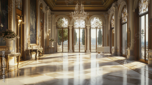 A beautiful Venetian palace with marble floors, crystal chandeliers, and expansive windows overlooking the canal.