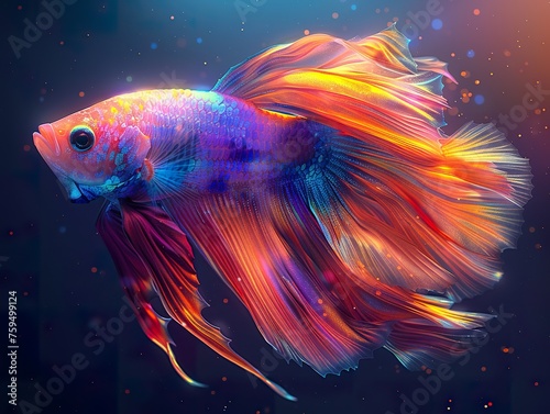 a beautiful very long-tailed Betta Splenders fish, colorful, front on view, iridescent opalescent colours illustration
