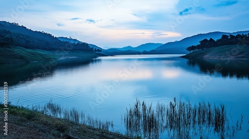 A beautiful view of Lam Takhong Reservoir during a tranquil evening.