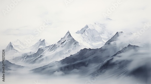 A beautiful watercolor painting of snow capped mountains with clouds rolling in.