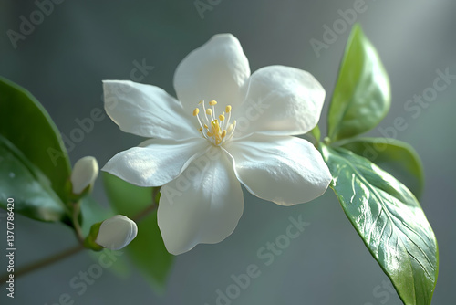 A Beautiful White Flower Blooming with Green Leaves in Soft Light