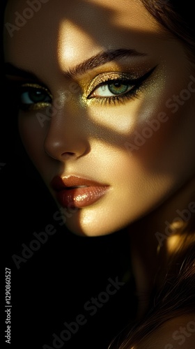 a beautiful woman with golden eyeshadow and eyeliner, facing the camera directly in front of her face, illuminated by soft studio lighting.