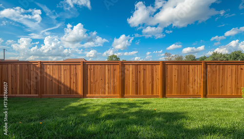 A beautiful wooden fence casting shadows on a lush green lawn under a bright blue sky with fluffy white clouds.
