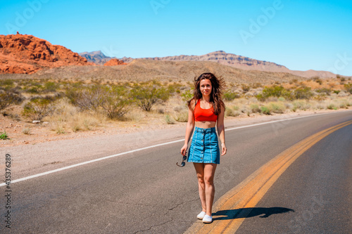 A beautiful young slender woman walks through the desert in the Valley of Fire in Nevada with an amazing landscape in the background.