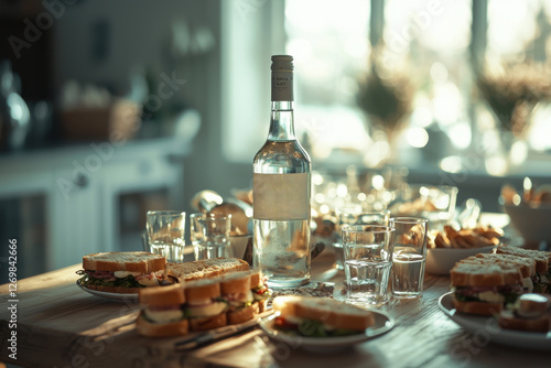 table setting, sandwich, drink, bottle, goggles, snack, food, indoor, gathering, casual attire, social, relaxed, party, celebration, arrangement, lighting, wooden table, refreshment, cookery, culinary, beverage, catering, event, entertaining, epicure, lunch, dinner, still life, homemade, fresh, tasty, delicious, nourishment, preparation, presentation, culinary arts, nobody, healthy, lifestyle, diet, light