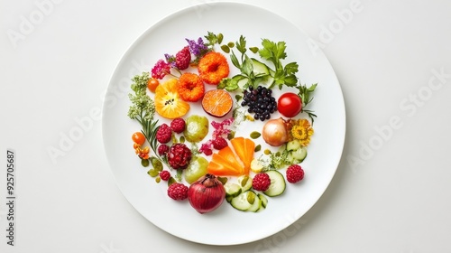 A beautifully crafted food art piece featuring intricate designs made from fresh fruits and vegetables, set on a white plate.