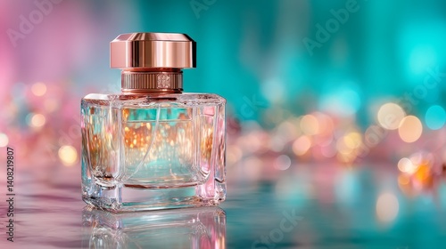 A beautifully crafted perfume bottle exudes elegance and charm, its luxurious design enhanced by a soft, ambient glow. The bottle's clear glass reveals the delicate liquid.