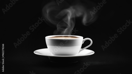 A beautifully crafted white ceramic cup filled with steaming hot coffee sitting against a dark black background.