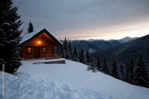 A beautifully crafted wooden cabin stands alone in a snowy landscape, surrounded by tall evergreen trees under a dusky sky, creating a peaceful winter getaway setting.