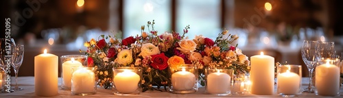 A beautifully decorated banquet table with candles and flowers