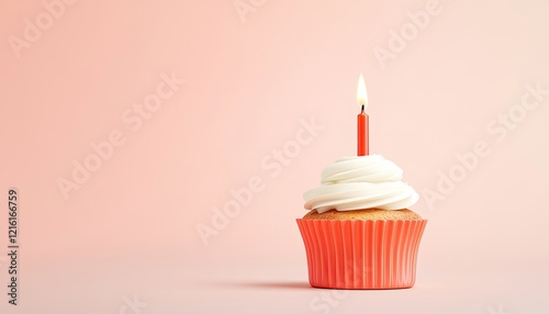 A beautifully decorated cupcake with a lit candle, set against a soft pastel background