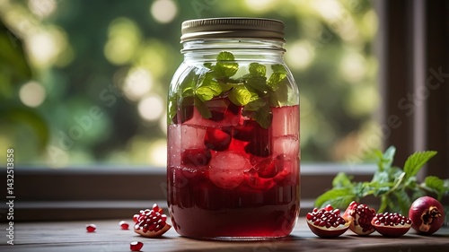 A beautifully decorated mason jar filled with pomegranate juice, ice cubes, and mint
