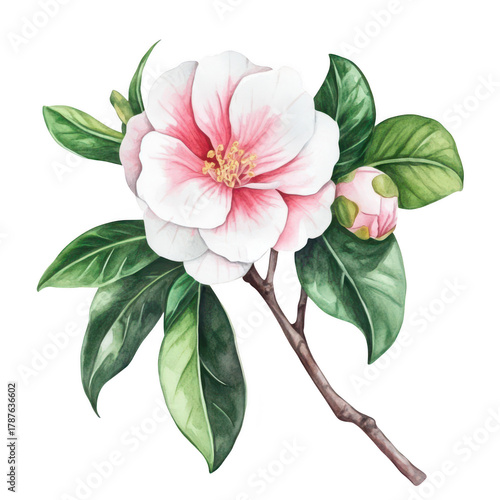 A beautifully detailed illustration of a pink camellia flower with lush green leaves and a budding flower. set against a clean white background. perfect for botanical art and floral designs