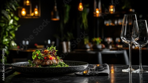 A beautifully plated dish served in an elegant restaurant setting, with dim lighting and decorative glassware enhancing the ambiance.