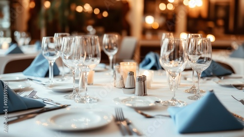 A beautifully set dining table with glasses, plates, and candles for an elegant meal.