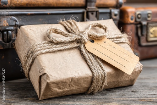 A beautifully wrapped brown paper gift box with a rustic twine bow and blank tag, presented against a backdrop of vintage suitcases, suggesting thoughtfulness.