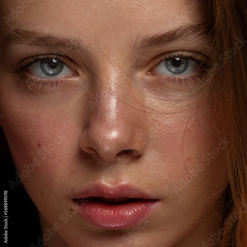 a beauty blonde woman portrait,close up,flying lock of hair