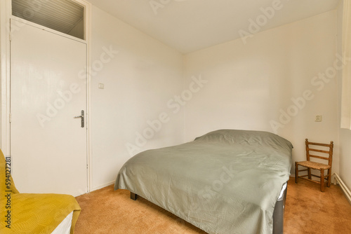 a bedroom with a bed, chair and closets in the back wall to the right is an empty room