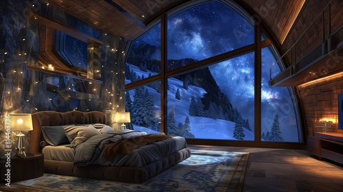 A bedroom with a grand, floor-to-ceiling window, offering a breathtaking view of the night sky