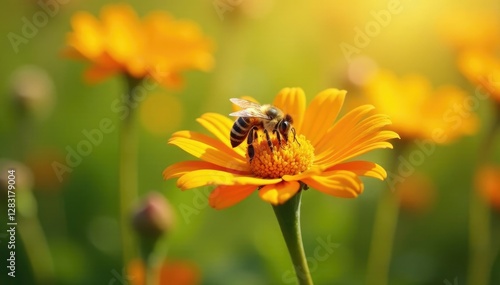 A bee collects nectar from a colorful flower in a sunny meadow, insects, pollination
