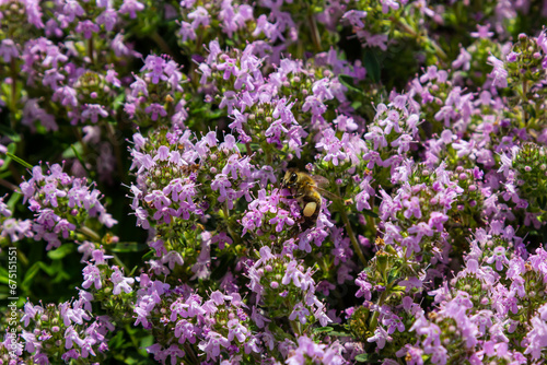 A bee collects pollen near a flower. A bee flies over a flower in a blur background