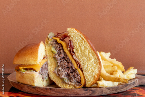 A beef burger with brioche bun cut in half to see inside