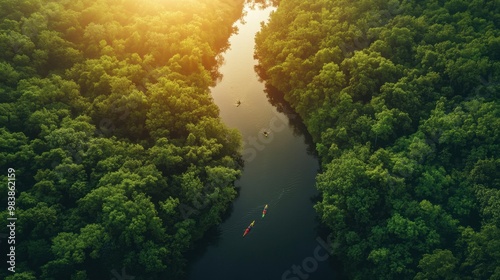 A bird -eye view of a winding river cutting through a dense forest, with kayakers paddling below and the sun shining through breaks in the trees.