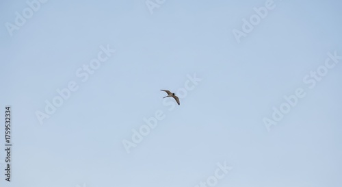 bird, flying, soaring, wing, sky, blue, clear, day, daylight, nature, wildlife, animal, avian, creature, freedom, flight, graceful, elegant, motion, movement, air, atmosphere, outdoors, open, space, horizon, distant, single, minimalist, simple, serene, peaceful, calm, tranquil, natural, environment, wild, free, independent, majestic, beautiful, view, scene, observation, watching